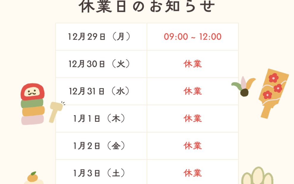 誠に勝手ながら、弊社の年末年始休業日を下…