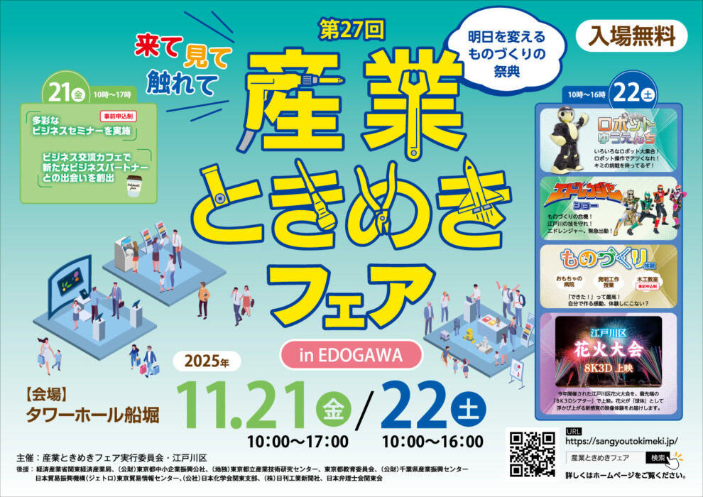 11月112025 お知らせ江戸川区 第27回産業ときめきフェア in EDOGAWAに出展します。 お知らせ, 江戸川区2025年11月11日 株式会社ウェルフィールドは、今年も「第27回産業ときめきフェア」に出展します。今回のテーマは 「音とWeb 音と空間」。Webとリアル、それぞれの世界で“音の空間”を体験できる展示を行います。 Webの中で“動く音” ス… もっと見る