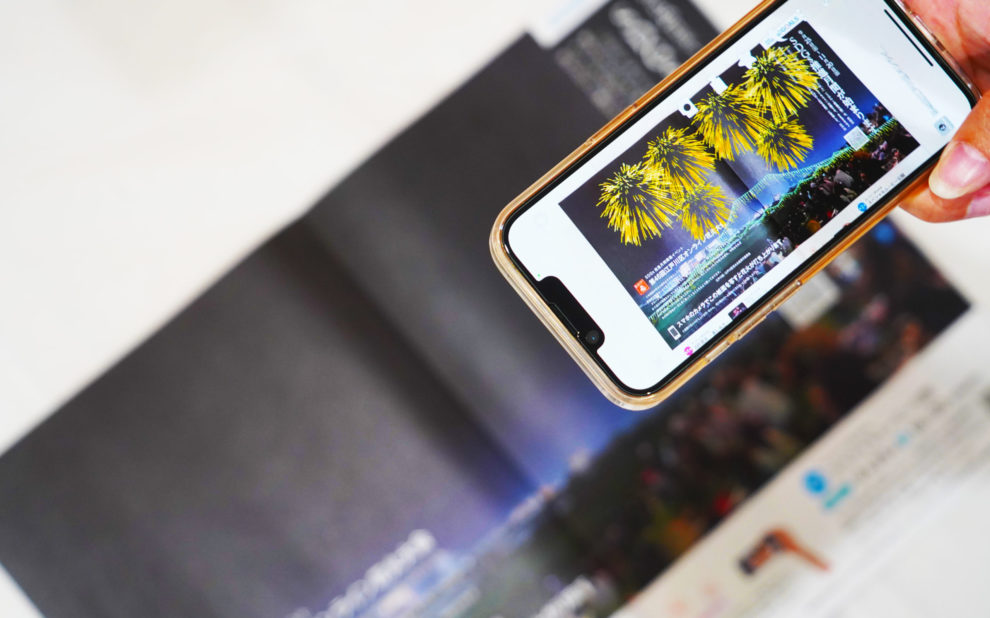 広報誌面にスマホかざして江戸川区花火大会…